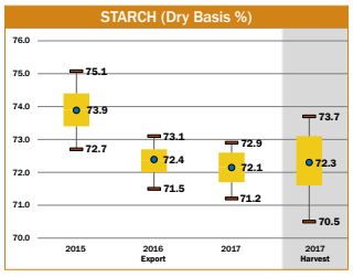 • The standard deviation for starch concentration of the 2017/2018 export samples (0.39%) was lower than the standard deviation of the 2017 harvest samples (0.65%).