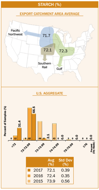• Average U.S. Aggregate starch concentration (72.1%) was slightly lower than 2016/2017 (72.4%), and lower than 2015/2016 (73.9%) and 5YA (73.4%). Average starch concentration at export (72.1%) was similar to harvest (72.3%).