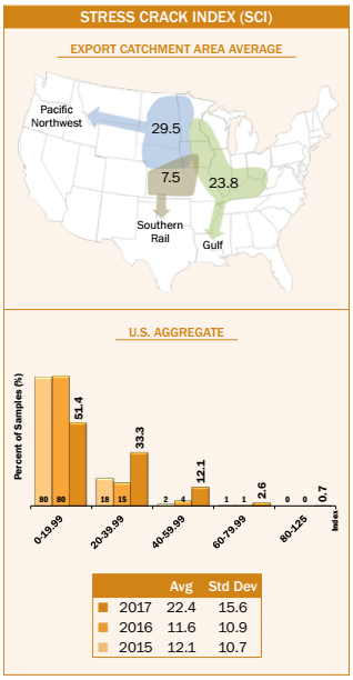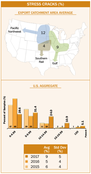 - Average U.S. Aggregate stress cracks (9%) was slightly higher than the 2017 harvest samples (5%). Average U.S. Aggregate stress cracks has increased from 1 to 4 percentage points between harvest and export for each of the last three years and for 5YA.