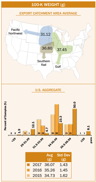 • Average U.S. Aggregate 100-k weight (36.07 g) was higher than 2016/2017 (35.26 g), 2015/2016 (34.73 g) and 5YA (35.37 g).