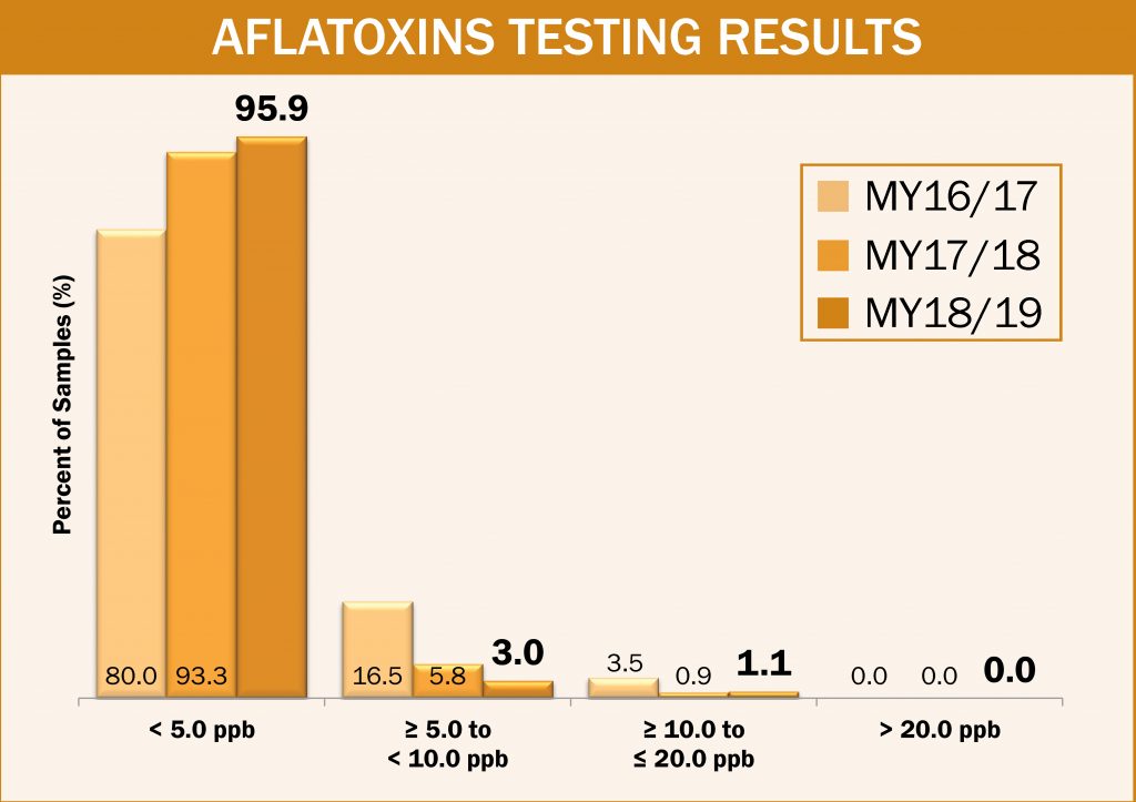 - Only five samples, or 1.1% of the 436 samples tested, in 2018/2019 had aflatoxin levels greater than or equal to 10.0 ppb, but below or equal to the FDA action level of 20.0 ppb. This 1.1% is about the same as 2017/2018 (0.9%) and less than 2016/2017 (3.5%).