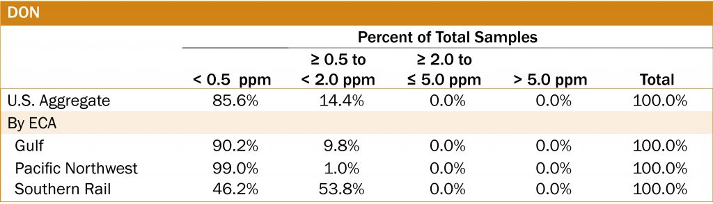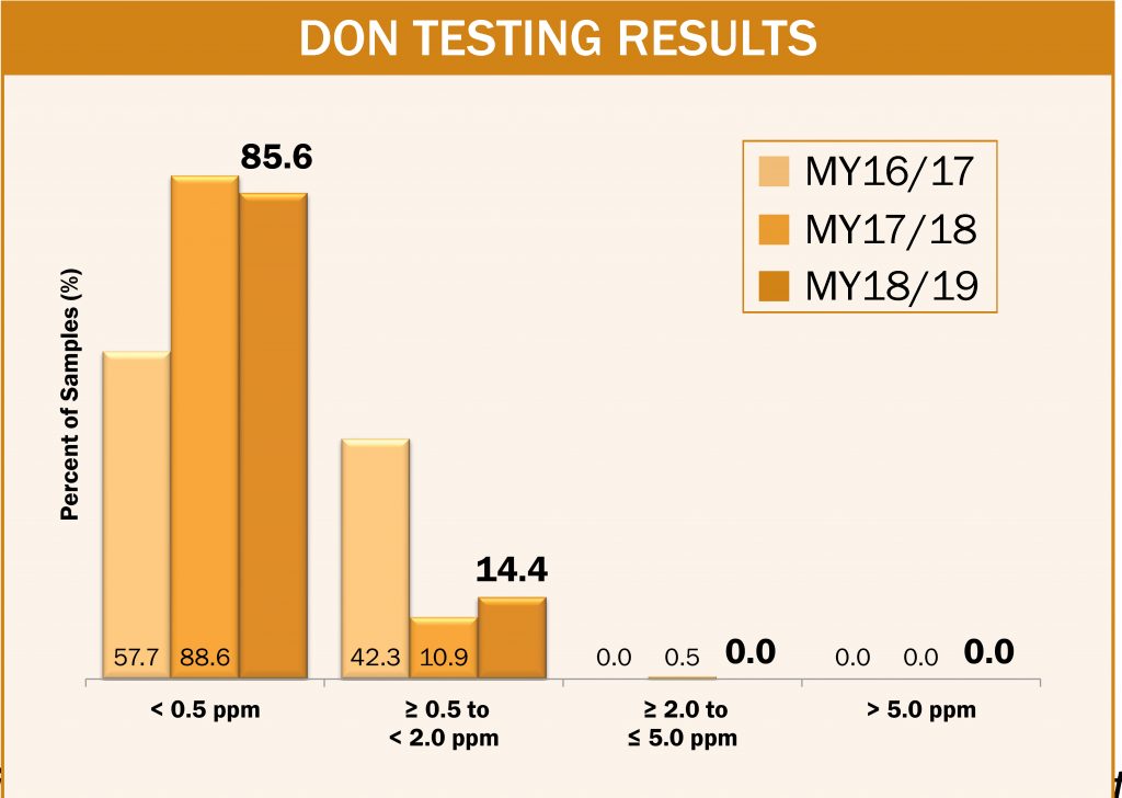 - No (0) samples, or 0.0% of the 436 samples tested in 2018/2019 had DON levels greater than or equal to 2.0 ppm, but less than or equal to the FDA advisory level of 5.0 ppm. This 0.0% for 2018/2019 is similar to 2017/2018 (0.5%) and 2016/2017 (0.0%).