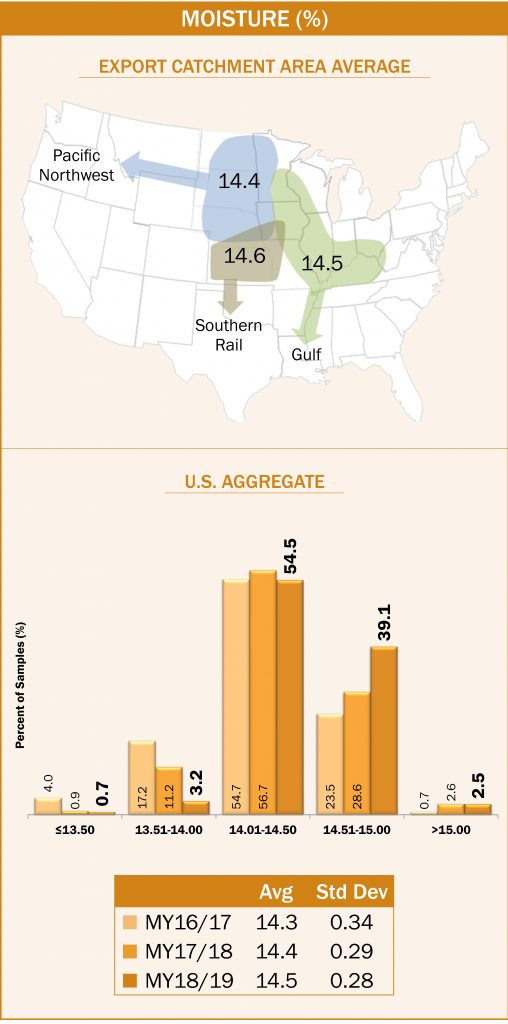 - Average U.S. Aggregate moisture content (14.5%) was slightly higher than 2017/2018 (14.4%), 2016/2017 (14.3%) and the 5YA (14.4%).