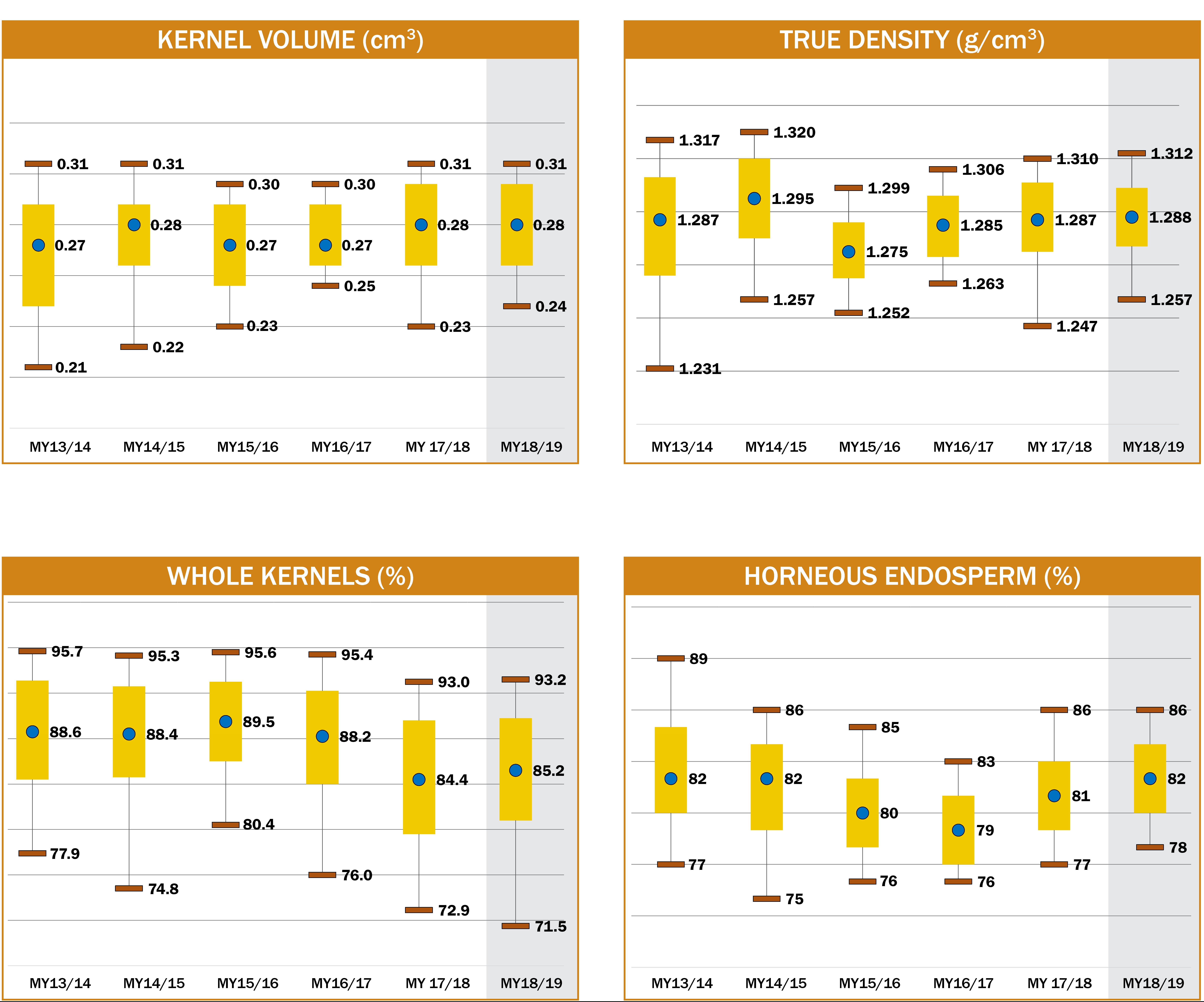 - Average U.S. Aggregate horneous endosperm (82%) was higher than 2017/2018, 2016/2017 and the 5YA. Of the 2018/2019 export samples, 81.7% had at least 80% horneous endosperm, in contrast to 72.0% in 2017/2018 and 25.3% in 2016/2017. Thus, in the last two years, a higher percentage of the samples contained high amounts of horneous endosperm than in 2016/2017.