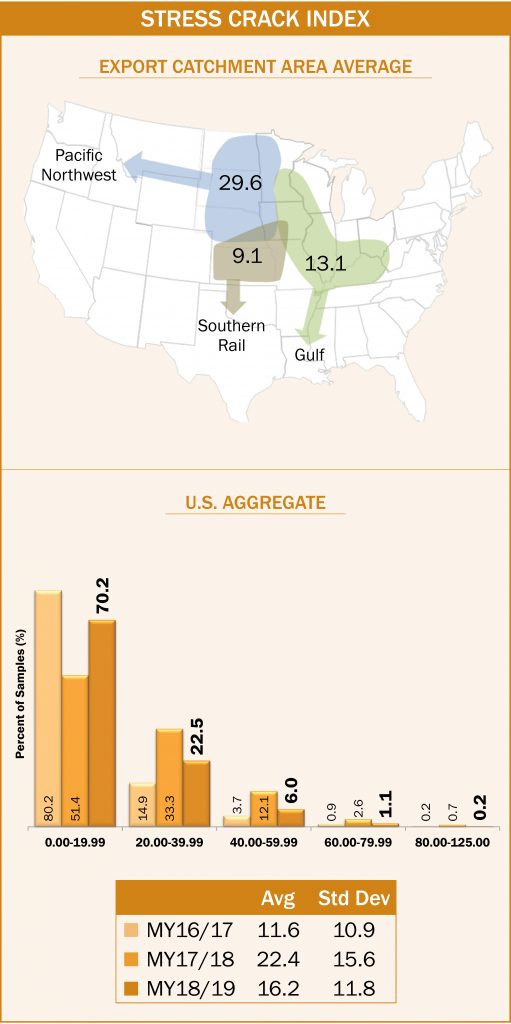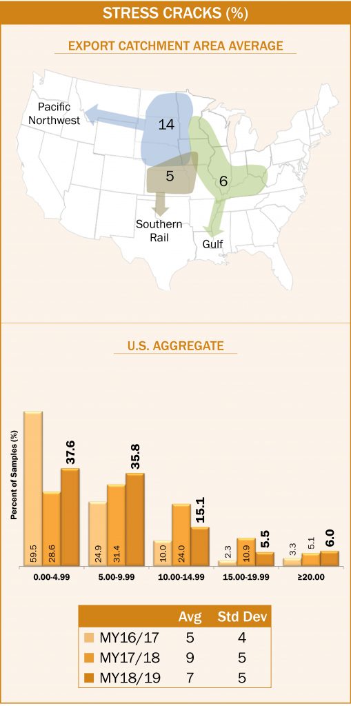 - Average U.S. Aggregate stress cracks (7%) was slightly higher than the 2018 harvest samples (5%). Average U.S. Aggregate stress cracks has increased from 1 to 4 percentage points between harvest and export for each of the last four years and for the 5YA.