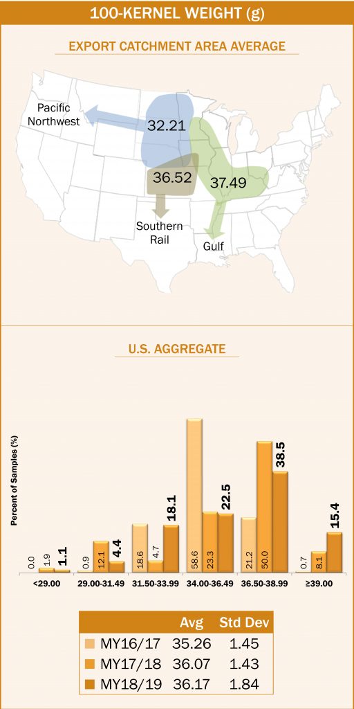 - Average U.S. Aggregate 100-kernel weight (36.17 g) was higher than 2017/2018 (36.07 g), 2016/2017 (35.26 g) and the 5YA (35.42 g).