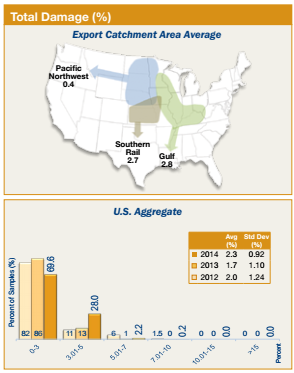 - Average U.S. Aggregate total damage (2.3%) was higher than 2013/2014 (1.7%), 2012/2013 (2.0%), and 3YA (1.8%), but still below the 3.0% limit for U.S. No. 1 grade.