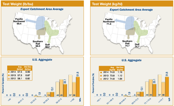 - Average U.S. Aggregate test weight (57.5 lb/bu or 74.0 kg/hl) was higher than 2013/2014 (57.3 lb/bu), but lower than 2012/2013 (58.1 lb/bu) and 3YA (57.7 lb/bu). However, the average U.S. aggregate test weight was above the limit for U.S. No. 1 grade (56.0 lb/bu).