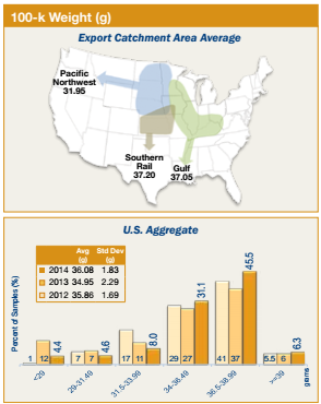 • U.S. aggregate 100-k weight averaged 36.08 g with a range of 26.22 to 40.86 g. This 100-k weight was higher than 2013/2014 (34.95 g) and 3YA (35.31 g).