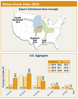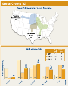 • Average stress cracks (14%) was lower than 2013/2014 (16%) but above 3YA (12%); however, the majority of the export samples (79.1%) had less than 20% stress cracks, and should have low rates of breakage during handling.