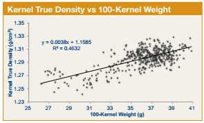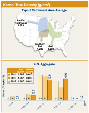 • Average kernel true density for the 2014/2015 export samples was higher than for the 2014 harvest samples (1.259 g/cm3). Average true density was also higher at export than at harvest in the previous two years. The 3YA true density (1.291 g/cm3) was also higher than the 3YA harvest true density (1.267 g/cm3). This higher true density at export is likely due, in part, to the higher 100-k weights that also occurred each year at export.
