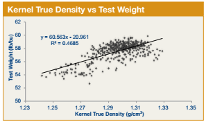 • The Pacific Northwest had the lowest average true density (1.273 g/cm3) and 100-k weight (31.95 g) among ECAs in 2014/2015, in each of the past two years and for 3YA. The Pacific Northwest also consistently had the lowest test weight among all ECAs the past two years and 3YA. True density and test weight are also weakly but positively correlated with each other (the correlation coefficient is 0.69) as shown in the accompanying figure.