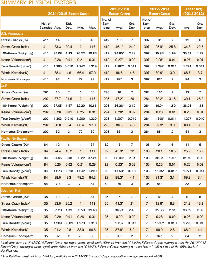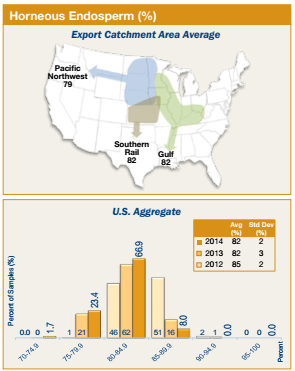 • U.S. Aggregate horneous endosperm averaged 82%, the same as 2013/2014 (82%), unchanged from 2014 harvest samples (82%), but lower than 3YA (84%).