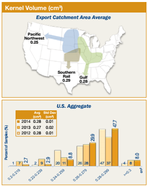 • Average kernel volume was smaller for the Pacific Northwest ECA (0.25 cm3) than for the Gulf (0.28 cm3) and Southern Rail (0.29 cm3) ECAs for 2014/2015 export samples. The Pacific Northwest ECA also had the lowest kernel volume for the previous two years, 3YA, and the 2014 harvest samples. Of the 2014/2015 export samples, 55.7% had kernel volumes equal to or greater than 0.28 cm3, compared with 45% in 2013/2014.