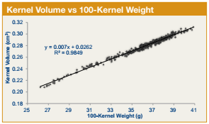Kernel volume in cubic centimeters (cm3) is often indicative of growing conditions. Small or round kernels are more difficult to degerm. Additionally, small kernels may lead to increased cleanout losses for processors and higher yields of fiber.