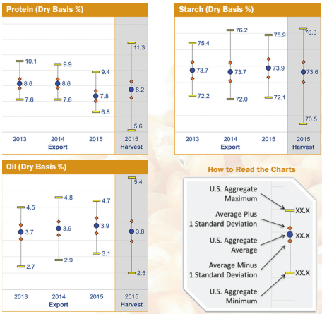 The chemical composition of corn consists primarily of protein, starch, and oil. Although they are not grade factors, these attributes are of significant interest to end users. They provide information related to nutritional value for livestock and poultry feeding, for wet milling uses, and for other processing uses of corn. Unlike many physical attributes, chemical composition values are not expected to change significantly during storage or transit.