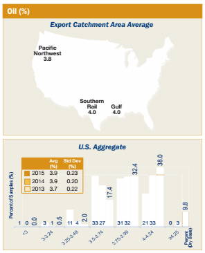 • Average U.S. Aggregate and Gulf ECA oil concentrations for contracts loaded as U.S. No. 2 o/b (3.9%) were slightly lower than contracts loaded as U.S. No. 3 o/b (4.0%).