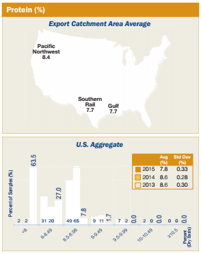 • Average U.S. Aggregate protein concentration at export (7.8%) was lower than 2014/2015 (8.6%), 4YA (8.8%), and the 2015 harvest average (8.2%).