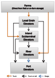 As corn is harvested, farmers transport grain to on-farm storage, end users, or commercial grain facilities. While some producers feed their corn to their own livestock, the majority of the corn moves to other end users (feed mills or processors) or commercial grain handling facilities such as local grain elevators, inland subterminal or river elevators, and port elevators. Local grain elevators typically receive most of their grain directly from farmers. Inland subterminal or river elevators collect grains in quantities suitable for loading on unit trains and barges for further transport. These elevators receive more than half of their corn from other elevators (usually local grain elevators) and are often located where the transport of bulk grain can be easily accommodated by unit trains or barges. Local grain, inland subterminal and river elevators provide functions such as drying, cleaning, blending, storing, and merchandising grain. River elevators and the larger inland subterminals supply most of the corn destined for export markets. The figure to the right conveys the flow of U.S. corn destined for export markets.