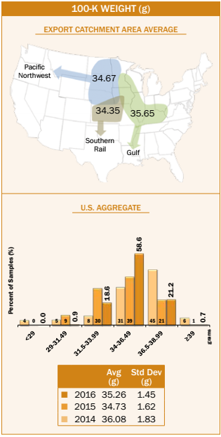 - Average U.S. Aggregate 100-kernel (100-k) weight (35.26g) was higher than 2015/2016 and similar to 5YA.