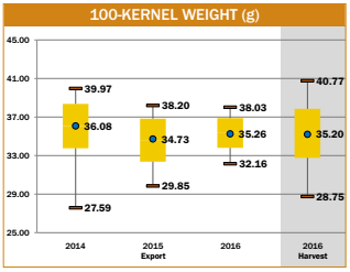 - The export samples had a lower standard deviation (1.45 g) than the 2016 harvest samples (2.43 g). The 100-k weight standard deviation was also lower at export than at harvest for 2015/2016, 2014/2015, and 5YA, indicating greater uniformity at export than at harvest.