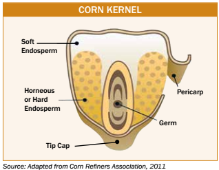 Physical factors are other quality attributes that are neither grade factors nor chemical composition. Physical factors include stress cracks, kernel weight, kernel volume, true density, percent whole kernels, and percent horneous (hard) endosperm. Tests for these physical factors provide additional information about the processing characteristics of corn for various uses, as well as corn’s storability and potential for breakage in handling. These quality attributes are influenced by the physical composition of the corn kernel, which is in turn affected by genetics, as well as growing and handling conditions. Corn kernels are made up of four parts: the germ or embryo, the tip cap, the pericarp or outer covering, and the endosperm. The endosperm represents about 82% of the kernel and consists of soft (also referred to as floury or opaque) endosperm and of horneous (also called hard or vitreous) endosperm, as shown above. The endosperm contains primarily starch and protein, the germ contains oil and some proteins, and the pericarp and tip cap are mostly fiber.