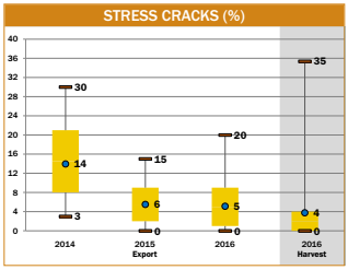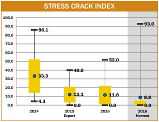 - Stress cracks in the export samples (with a range of 0 to 27% and a standard deviation of 4%) were more uniform than in the 2016 harvest samples (with a range of 0 to 84% and a standard deviation of 6%).
