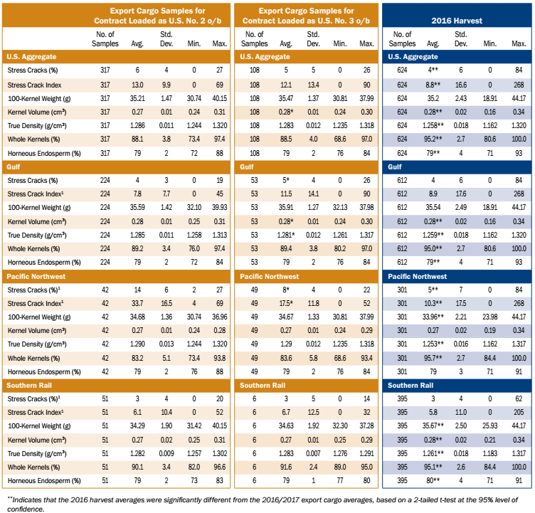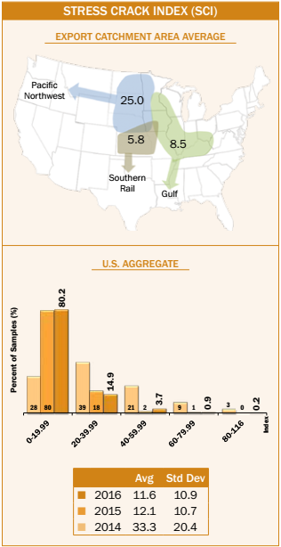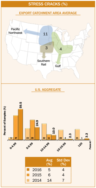 - Average U.S. Aggregate stress cracks (5%) were higher than the 2016 harvest samples (4%). Average U.S. Aggregate stress cracks have increased from 1 to 6 percentage points between harvest and export for each of the last three years and for 5YA.