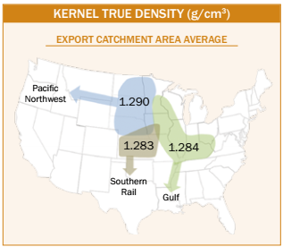 - Average kernel true densities were similar for the Gulf (1.284 g/cm3), Pacific Northwest (1.290 g/ cm3), and Southern Rail (1.283 g/cm3) ECAs.