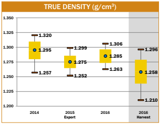 - Average kernel true density for the 2016/2017 export samples was higher than for the 2016 harvest samples (1.258 g/cm3), and the export 5YA true density (1.289 g/cm3) was higher than the harvest 5YA true density (1.263 g/cm3). Average true densities have been 0.021 to 0.036 g/cm3 higher at export than at harvest over the past six years.