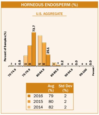 - The 2016/2017 export samples for horneous endosperm had a smaller range (72 to 88%) and standard deviation (2%) than the 2016 harvest samples. This same pattern of increased uniformity for export samples compared to harvest samples occurred in 2015/2016, 2014/2015, and 5YA also.