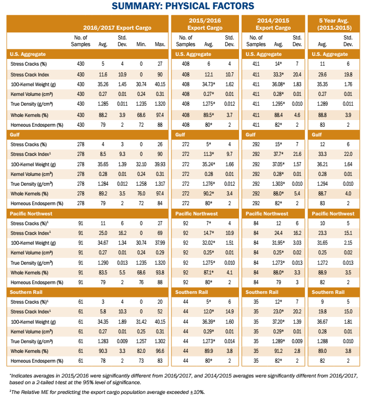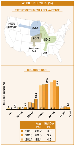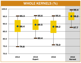 - The average percent of whole kernels at export (88.2%) was slightly lower than 2015/2016 and 5YA.