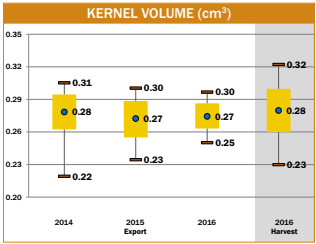 - Of the 2016/2017 export samples, 88.8% had kernel volumes equal to or greater than 0.26 cm3, compared to 75% in 2015/2016 and 86% in 2014/2015, which indicates a similar percentage of large kernels over the past two years.
