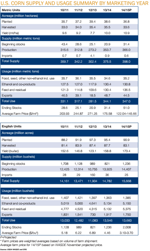 - Global corn production during MY14/15 is expected to be a record-setting year, primarily due to the large U.S. corn crop.