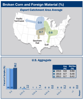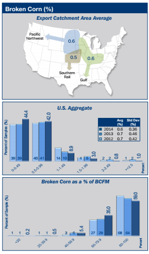 - Broken corn in the U.S. Aggregate samples averaged 0.6% in the 2014 crop, slightly lower than the levels in 2013, 2012 and for 3YA (all 0.7%).