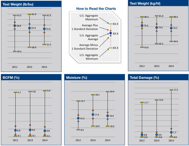 - Sample values were more uniform in the 2014 crop relative to 2013, as indicated by the lower U.S. Aggregate standard deviation (1.34 lb/bu). Standard deviation for 2013 was 1.51 lb/bu.