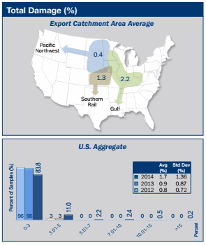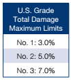 - Total damage in the U.S. Aggregate samples averaged 1.7% in 2014, significantly higher than 2013 (0.9%). Although much higher than 3YA (0.9%), 2014 total damage was still well below the limit for No. 1 grade (3%). Total damage may have been higher in part due to delayed harvest in 2014 compared to previous years.