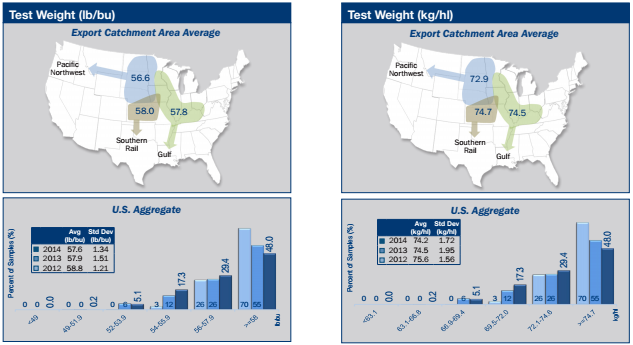 - U.S. Aggregate average test weight in 2014 was 57.6 lb/bu (74.2 kg/hl) compared to 57.9 lb/bu (74.5 kg/ hl) in 2013 and 58.8 lb/bu (75.6 kg/hl) in 2012.