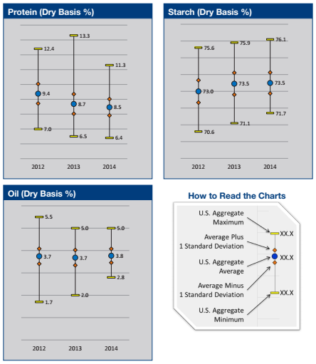 - U.S. Aggregate starch average concentration was higher in 2014 (73.5% dry basis) than 3YA (73.3%). The higher starch indicates good kernel filling that should be desirable for corn wet milling.