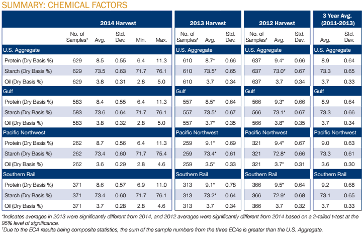 - Among ECAs in 2014, the Gulf had lowest protein (8.4%), highest starch (73.6%), and highest oil (3.8%). In comparing 3YA among ECAs, the Gulf again had lowest protein (8.9%), and it tied for highest starch with Pacific Northwest (73.3%).