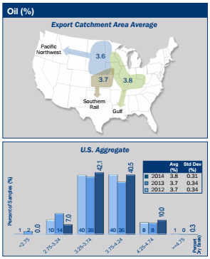 - Oil concentration ranged from 2.8 to 5.0% in 2014, 2.0 to 5.0% in 2013, and 1.7 to 5.5% in 2012. Oil concentration in 2014 was distributed with 49.1% of the samples at 3.74% or lower, 40.5% of samples at 3.75% to 4.24% and 10.3% at 4.25% and higher. The distribution shows more samples had higher oil levels than in 2013 or 2012.