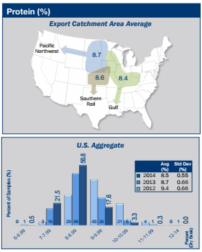 - Protein concentration averages for Gulf, Pacific Northwest, and Southern Rail ECAs were 8.4%, 8.7%, and 8.6%, respectively. The Gulf ECA had the lowest protein for 2014, 2013, 2012 and 3YA.