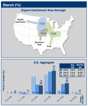 - Starch concentration averages for the Gulf, Pacific Northwest, and Southern Rail ECAs were 73.6%, 73.4% and 73.4%, respectively. Starch concentration averages were highest in the Gulf ECA in 2014, 2013 and 2012. Thus, the Gulf ECA had highest starch and lowest protein in each of the last three years.