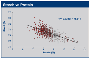 - Since starch and protein are the two largest components in corn, when the percentage of one goes up the other usually goes down. This relationship is illustrated in the adjacent figure showing a weak but negative correlation (-0.61) between starch and protein.