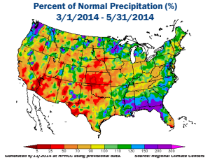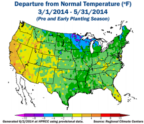 Overall, for the key corn-growing areas in 2014, a cold spring led to a less than average amount of April planting. However, May had warm, dry weather, resulting in 30% of the corn planted in one week, thereby returning planting progress to the long-term average. Only a few areas with excessive rain had poor emergence due to the soil crusting over, making it difficult for the corn shoot to push through.