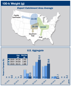 - 100-k weight for U.S. Aggregate corn in 2015 averaged 34.34 g, higher than 2014 (34.03 g), 2013 (33.41 g), and 4YA (33.77 g).