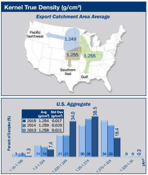 - In 2015, kernel true densities for the Gulf, Pacific Northwest and Southern Rail ECAs averaged 1.255 g/cm3, 1.249 g/cm3, and 1.255 g/cm3, respectively. Pacific Northwest average true density and test weight were lower than the other ECAs’ values in 2015, 2014, 2013 and 4YA.