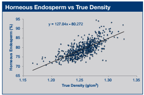 - The adjacent figure shows a weak but positive relationship (a correlation coefficient of 0.72) between horneous endosperm and true density for the 2015 samples.