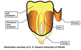 Physical factors are other quality attributes that are neither grading factors nor chemical composition. Physical factors include stress cracks, kernel weight, kernel volume and true density, percent whole kernels, and percent horneous (hard) endosperm. Tests for these physical factors provide additional information about the processing characteristics of corn for various uses, as well as corn’s storability and potential for breakage in handling. These quality attributes are influenced by the physical composition of the corn kernel, which is in turn affected by genetics and growing and handling conditions. Corn kernels are made up of four parts: the germ or embryo, the tip cap, the pericarp or outer covering, and the endosperm. The endosperm represents about 82% of the kernel, and consists of soft (also referred to as floury or opaque) endosperm and of horneous (also called hard or vitreous) endosperm, as shown to the right. The endosperm contains primarily starch and protein, the germ contains oil and some proteins, and the pericarp and tip cap are mostly fiber.