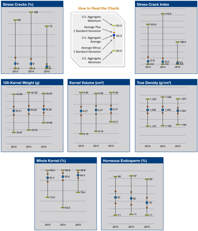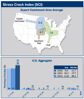- The high percentage of the crop having near 75% good-to-excellent crop growing conditions, along with good maturation and grain filling, early harvest conditions and favorable field drying conditions, led to less artificial drying and the very low stress cracks and SCI found in 2015.